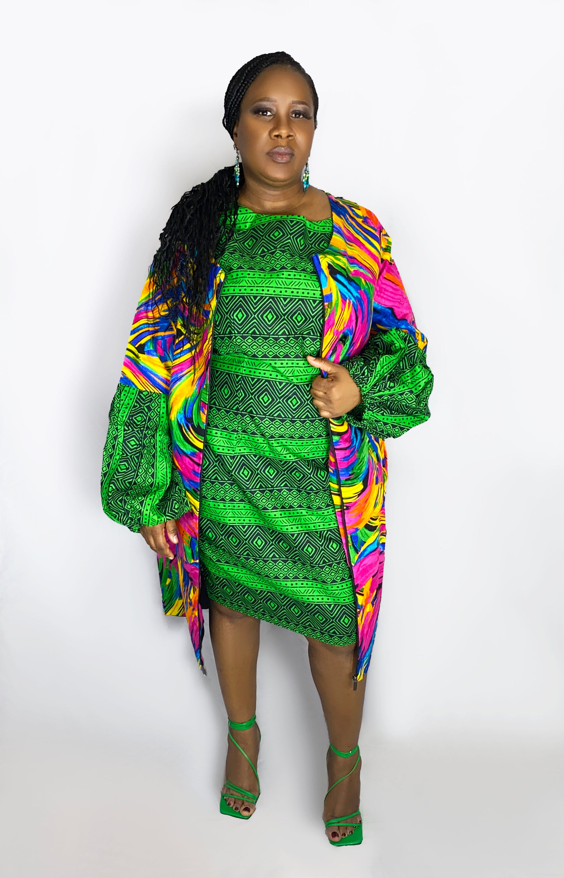 Look chic in this Ankara Jacket + Dress Set! The 2-piece set features a funky puff-sleeve jacket paired with a stylish sleeveless midi dress. Perfect for any occasion, this set will make you stand out with its unique design and vibrant ankara print. Stay fashion-forward and playful with this versatile set.