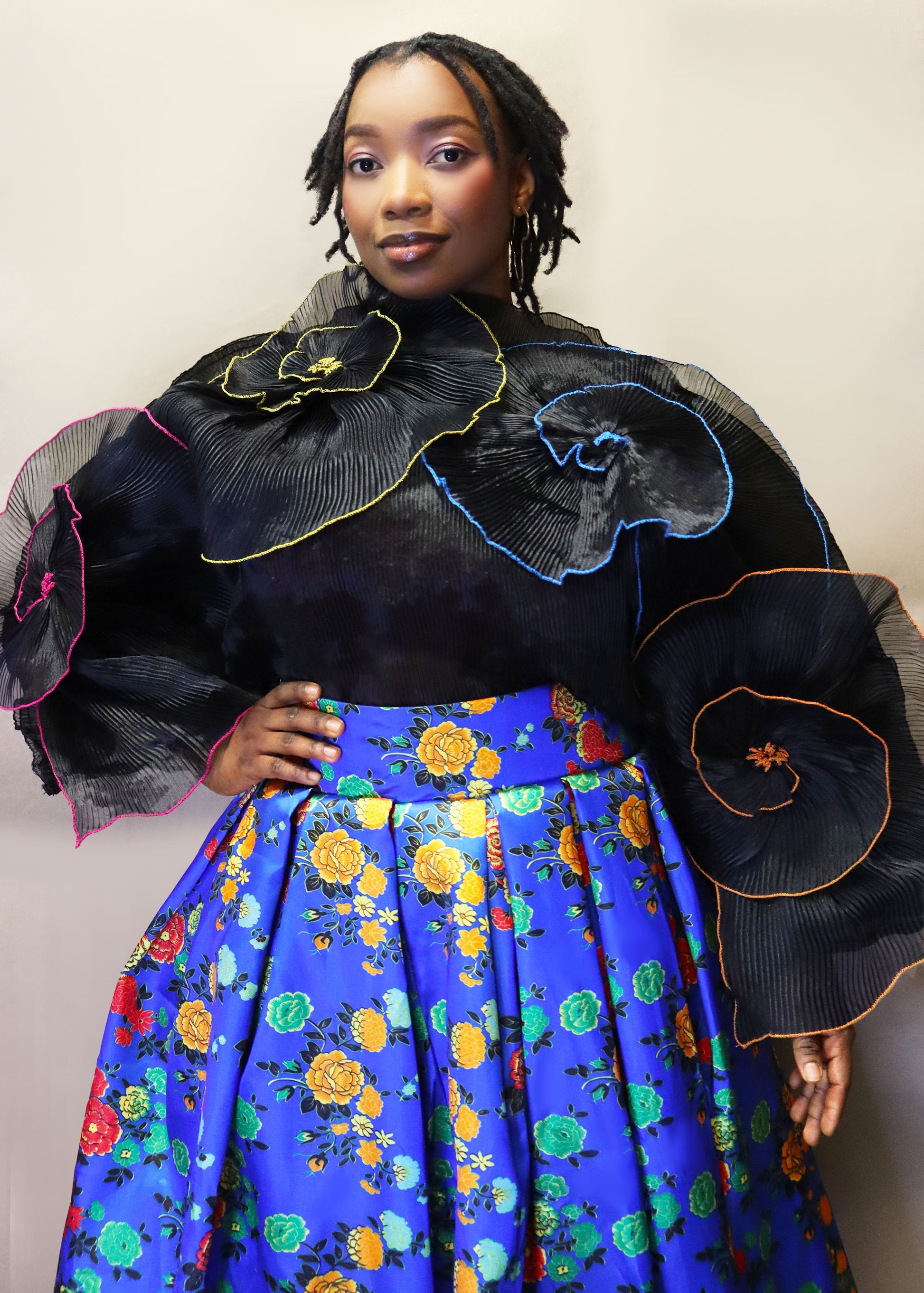 Offered in a sleek solid-color option or an elevated version adorned with sculpted chiffon 3D flowers, this piece brings high-fashion artistry to the forefront. The floral design arcs from sleeve to sleeve and is lined with a vibrant pop of color, adding dimension, texture, and a modern couture feel.