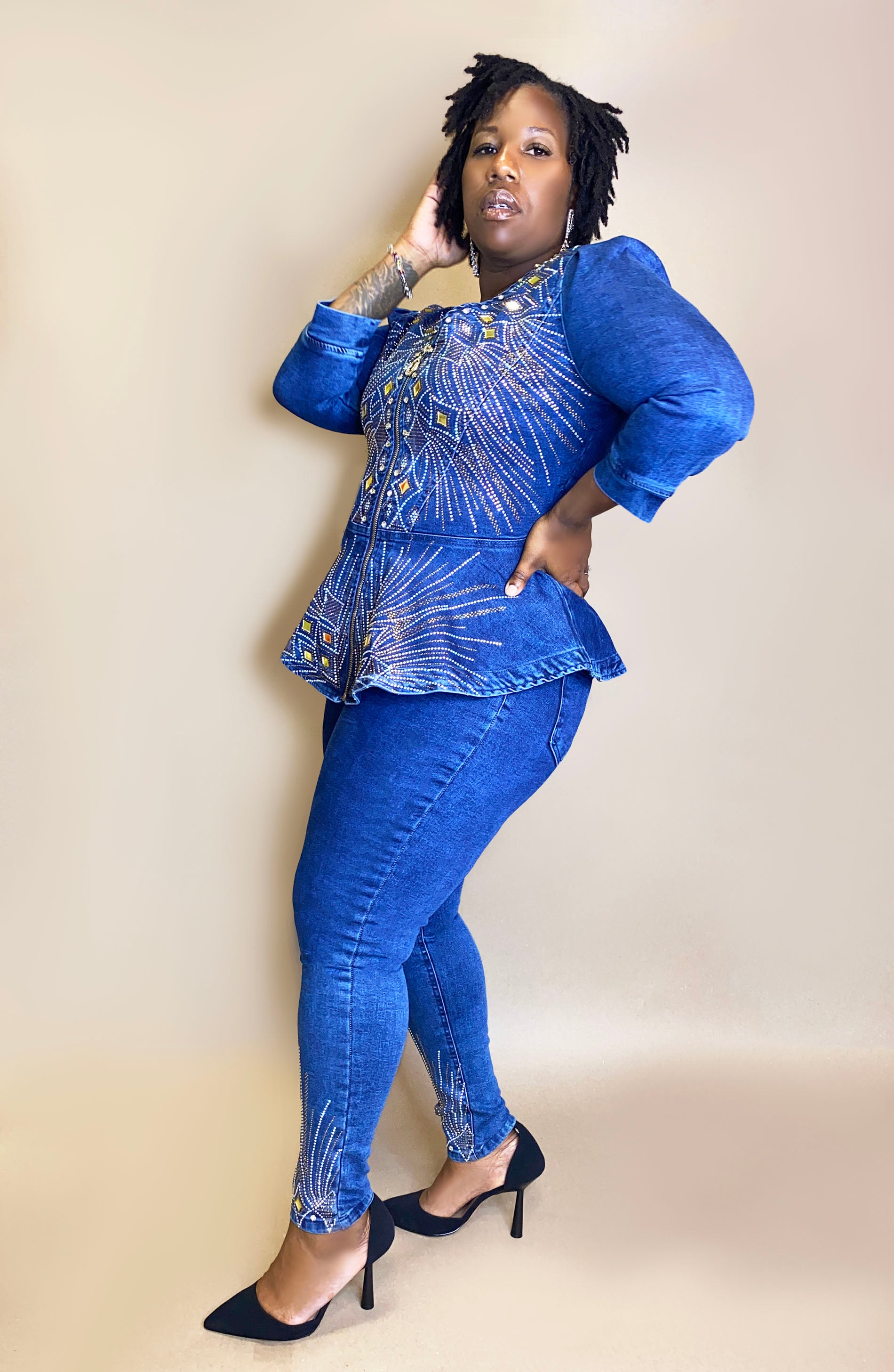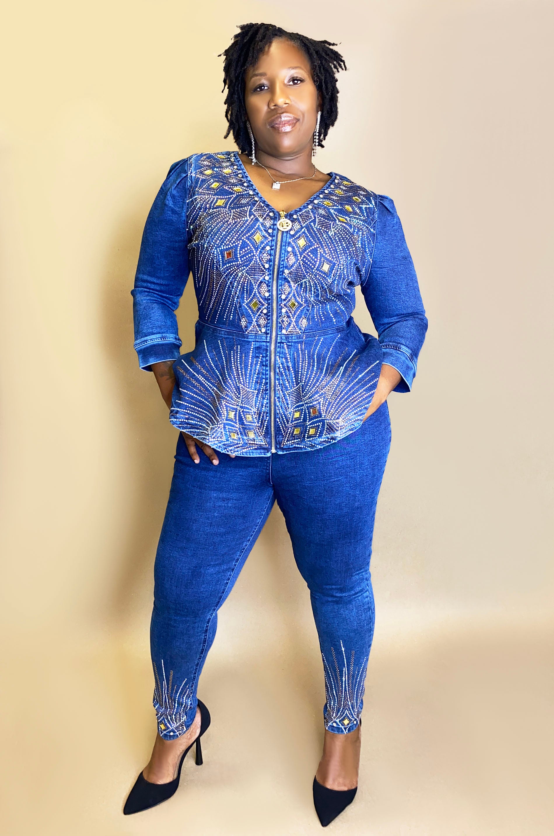 This 2-piece pantsuit features an eye-catching rhinestone design. Both the skinny jeans and peplum flare jacket feature a denim fabric that is stretchy and comfortable, providing a perfect fit that hugs and accentuates your curves. Elevate your denim game with this stylish and versatile ensemble.