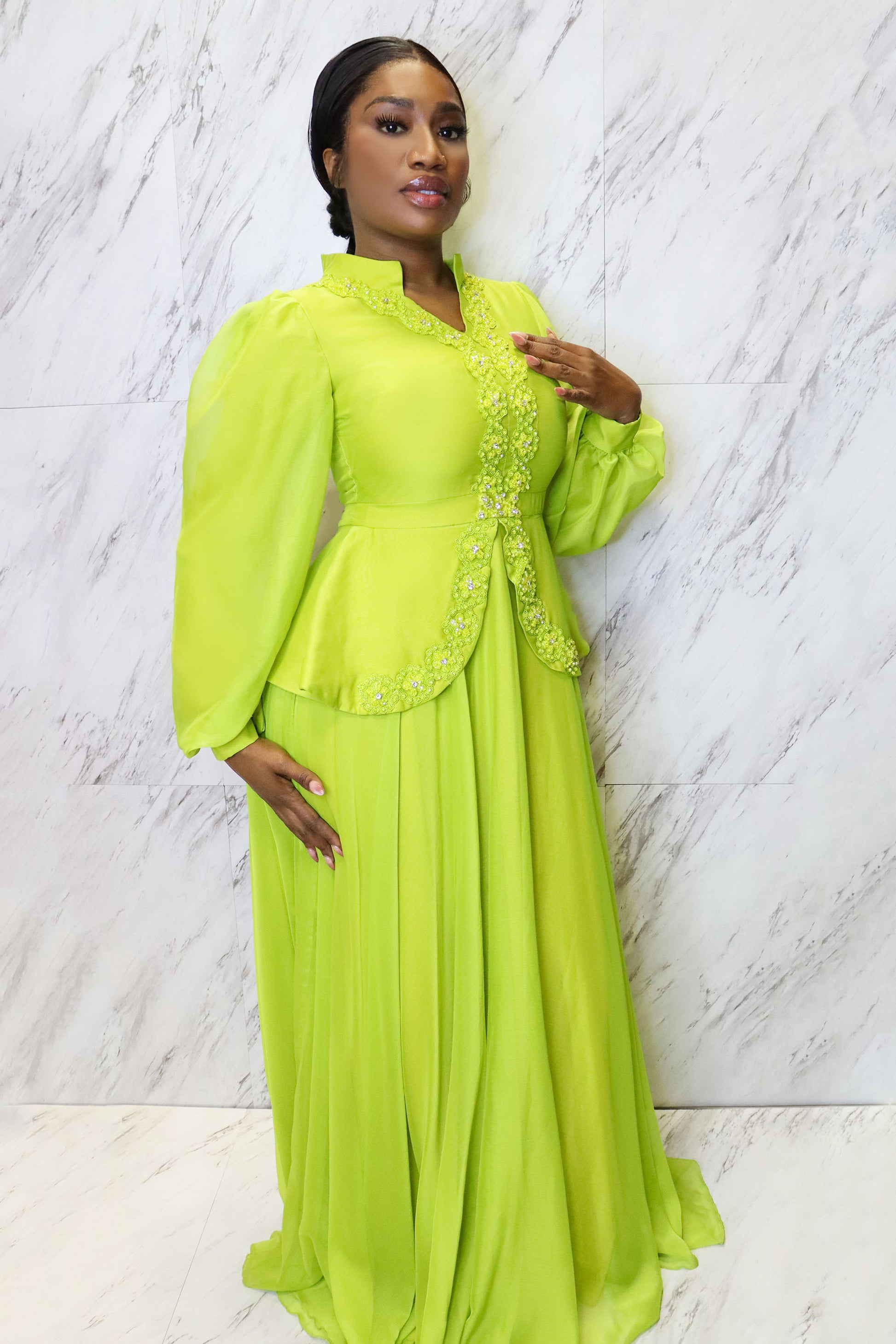 This lime vintage gown features a flowy A-line silhouette that exudes timeless elegance. Its high neckline offers a refined, conservative appeal, while delicate floral embellishments adorn the chest, adding intricate detail and charm. Perfect for formal occasions, this gown combines classic style with subtle decorative touches for a sophisticated statement.